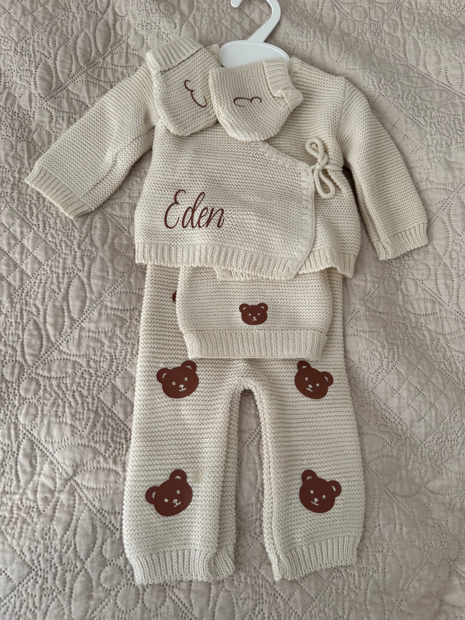 Composé d’une brassière, d’un pantalon, d’un bonnet ainsi que d’une paire de moufles, cet ensemble offre un look raffiné et confortable dès les premiers mois.